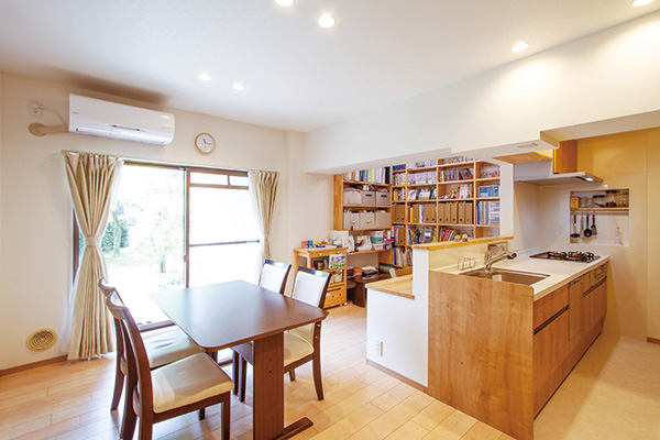 独立していたキッチンを一体化したLDK。廊下との仕切り壁もなくして広く開放的になった。子どもたちと一緒に立てるよう、キッチンの通路は幅を広めに設計。使い勝手の良いキッチンからは子どもたちが勉強したり遊んだりする様子を見守ることができる。