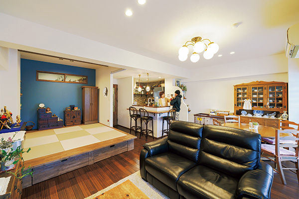 以前は和室と仕切られ広く使えなかったリビング。奥様のセンスで選ばれた家具や雑貨が、生まれ変わったLDKにしっくりと馴染んでいる。ここがマンションということを忘れさせてくれる空間に変身。