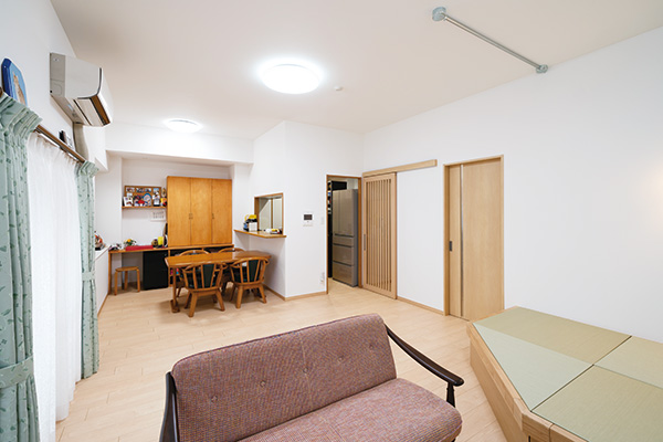 洋室を取り込み、広さを増したLDK空間。お孫さんを寝かせたり、遊ばせたりするのも便利な畳コーナーも設けた。寝室からトイレの動線も移動しやすいよう配慮。キッチンは既存のものを残している。扉はレールの溝が床にないタイプなので掃除もラクと好評だ。結露対策の二重窓は断熱効果に◎。