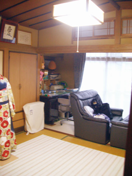 奥さまが着付けができるようにと設けられた和室は、和紙畳や珪藻土壁といった自然素材をふんだんに取り入れて構成。レトロ感たっぷりの照明器具は、母屋にあったものを再利用。優しい雰囲気を漂わせる。