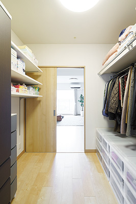 ウォークスルークロゼット。衣類ハンガーはしまう用とすぐに着る用でバーを分けて活用。しまう用は服が壁に付かないよう手前に設置。