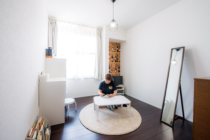 奥様専用の洋室。清潔感のあるプライベートスペースで読書などをゆったりと楽しむ。ワインボトルをあしらったユニークなデザインクロスが目を引く。プライベートなスペースだからこそ、遊び心を楽しむ提案として要所に彩りのアクセントクロスを採用。色や質感が視線を楽しませ、心まで豊かにしてくれる。