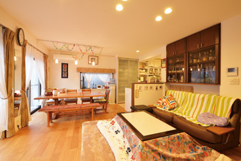 | あまりにひどい結露に悩み、マエダハウジングにリフォームを依頼したSさん。窓をペアガラスにして結露対策をし、キッチンとリビング、和室を一体化してゆったりLDKを創出。対面キッチンの導入やパントリーの新設でキッチンの使い勝手も向上させた。また、北側の部屋とLDKの間の風通しがいま一つだったため、食器棚の下半分をカット。階段下を収納と風通しのための空間として活用することにした。リフォームから約2年が経ち、再びSさんを訪ねたところ、お孫さんとともにお出迎え。よく遊びにくるお孫さんが気持ち良く過ごせるよう、床にクルミの無垢材を貼ったLDKでSさん夫妻に甘えるお孫さんが何とも微笑ましい。「パントリーはとても便利ですね。ただ、かなりの容量を確保していただいたので、ついつい物を入れすぎてしまいがちに...」と苦笑する奥さま。パントリー内のカウンターは、アイロンがけなどの家事以外にも、手紙を書いたりするのにとても重宝しているとのこと。悩みだった結露はやや残る程度に抑えられ、一方でペアガラスの遮音性の高さを実感。風通しの良さや収納スペースの利便性などにおいても、リフォーム効果を感じているという。 |