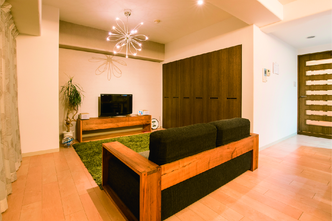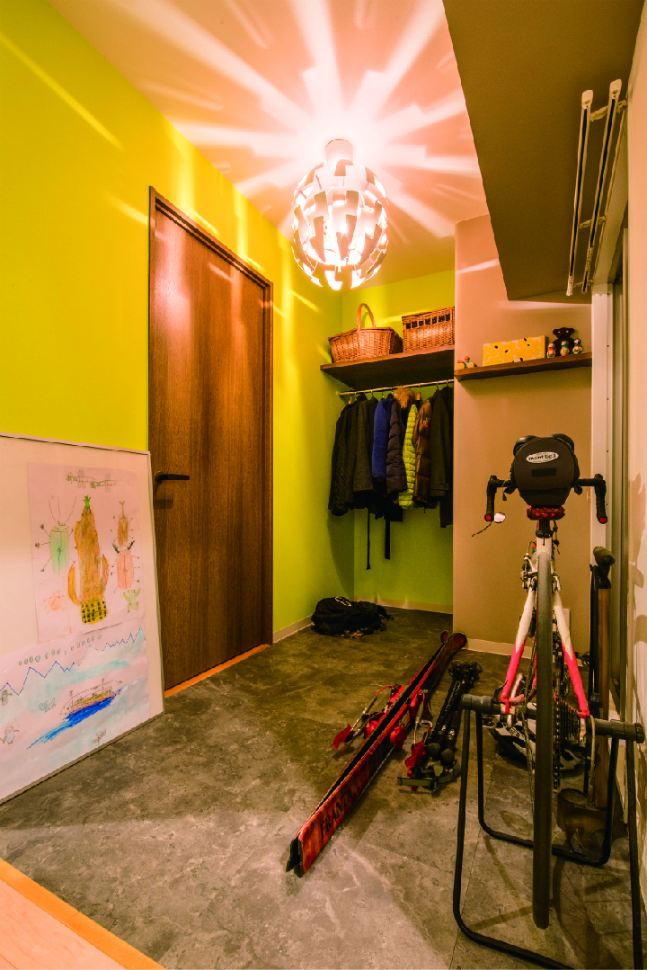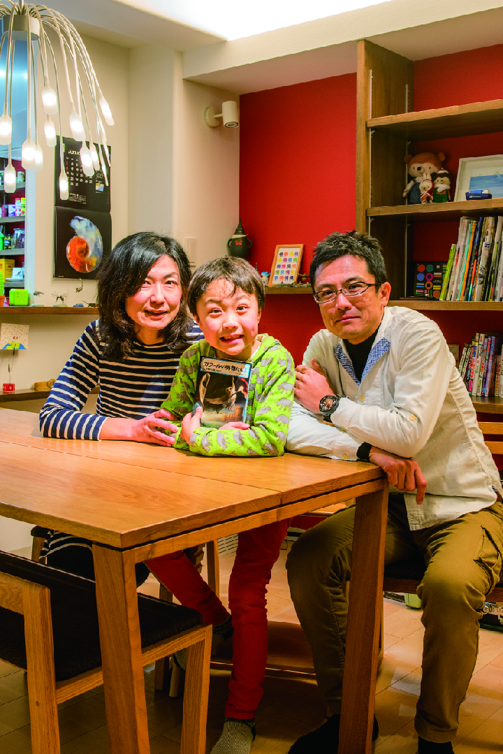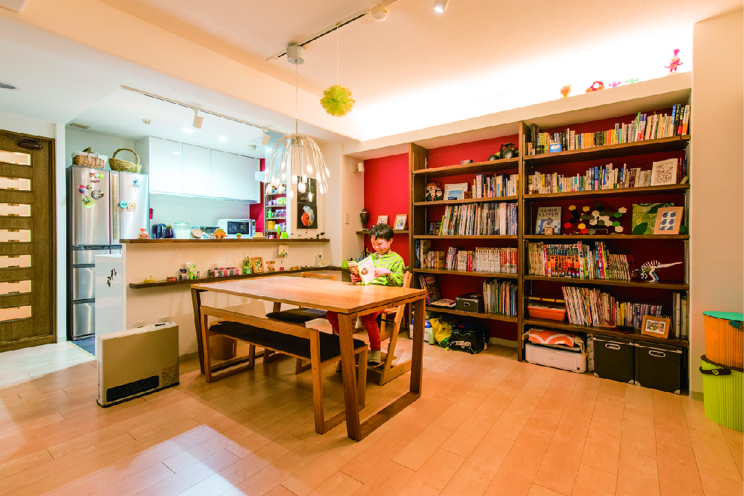 築24年のマンションを購入してリフォームを行ったK様。地震でも倒れないよう造り付けにした本棚と赤いクロスが印象的で、アウトドア好きなご主人が自転車やスキー板などを置ける土間の新設、空間ごとに雰囲気を変えるクロス選びな どで満足度の一局いリフォームを実現。3年経った今も、風通しが良く夏は扇風機だけで過ごし、冬も結露に悩まされることがないなど、住み心地は相変わらず快適と言う。 「息子が本を好きになってくれるようにという願いも込めた」という本棚には蔵書が増え、息子さんもすっかり本好きに。当初予定していなかった天井の間接照明は、夏は蛍光色で爽やかに、冬は温もりのある暖色系に調光することで体感温度もかなり違うらしく、「コーディネーターの佐々木さんの提案通りにして良かったです」とご主人。使い勝手の良いホー口ーのキッチンは、汚れにくく掃除の頻度が少なくてすみ、食洗機の導入で家事の時短ができたなど、仕事を持つ奥様の強い味方に。ご主人の願いを叶えた土間は、スポーツで濡れたり汚れたりしたウェアや道具などを、一時的に置いて乾かすことができるのがありがたいと一言う。 「リフォームをしていなかったら、不満を抱えたまま暮らしていたはず。思い切って実行して良かったです」とご主人。奥様もキッチンが広く使いやすくなり、「料理をもうー品多く作ろうかな」など、以前にも増して意欲的になったとのこと。「道具が片付けやすくなったり料理をもっと作りたくなるなど、前よりもいろいろなことに積極的になれた気がします」と、家族の意識も変化。収納も造り込まず、家族の成長に合わせて増やせば良いというスタンスは、今考えても正解だったと振り返る。ベランダでは野菜や果物を育て、家庭菜園も楽しんでいるK様一家。これからも、いろいろなことにチャレンジしていくことだろう。