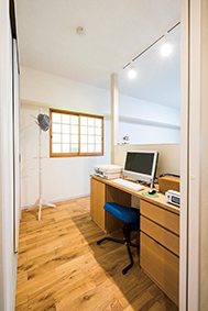 | 電気コード類は壁の中にまとめてすっきりとさせた | ペールブルーの壁クロスが空間のアクセントに |
