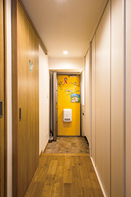 | 冷蔵庫を白に新調して奥様好みの統一感が完成 | 個性的な黄色の内玄関。3面収納は希望の寸法で設計 |