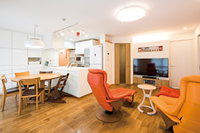 ご夫婦の職場やお子さんたちの学区を考え、住んでいるマンションに暮らしながら、悩みや心配事を解消したいとの思いからリフォームを決心されたW様。マンションという限られた空間で、成長と共に増える子どもたちの生活用品をどう納めていくか、マエダハウジングとアイデアを出し合い、収納の確保と明るいLDKを中心に生まれ変わった住まいは「今も快適です」とほほ笑む。
