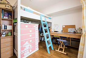 | 暗かったLDKはバルコニー側に移して明るく開放的に。3人掛けだったソファが家族1人ずつ専用になったのも成長の証し | 娘さん専用の部屋。ものが増えても狭く感じないよう、デッドスペースを上手に活用。家具のセンスも女の子らしく |
