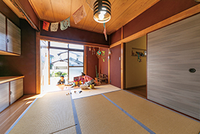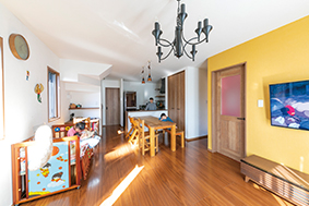 | 家族が自然に集まるLDK。3人目のお子さん用のベビーベッドを置いても、収納家具が増えていないため余裕がある | 壁を設け独立した和室は、子どもたちが元気に遊べるスペース。日が降り注ぐ明るい広縁に、メキシコ雑貨が彩りをプラス |
