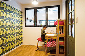 | 玄関に造作した収納はオープンで使いやすい | 個性的なクロスを壁面に配した子ども部屋。窓からはリビングの様子もわかり、落ち着いて勉強ができる |