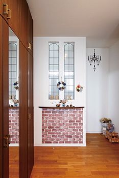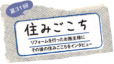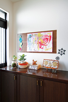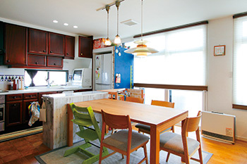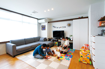 奥様の実家をリフォームして家族3人で暮らし始めたIさん一家。奥様のご両親の意向を踏まえ、システムキッチンや玄関に使われていた模様入りガラスなどを活用して、以前の家の雰囲気を残すプランニングを実践。床は無垢材、壁は施主施工で漆喰塗りにするなど、自然素材も積極的に採用した。また、窓はペアガラスにし、断熱性や遮音性を向上させてさらに快適な居住空間を実現するリフォームを行った。 それから約3年が経ち、Iさん一家は娘さんの誕生で4人家族に。息子さんと娘さんがリビングで伸び伸びと遊べるよう、リビングとダイニングを仕切る形で置かれたソファの向きを変えて窓側に移動し、スペースを確保。「ソファの移動で結果的に視界が広くなりました」と奥様。キッチンから子どもたちが遊ぶ姿を見ながら料理の盛り付けをしたり、一緒にパン作りを楽しむなど、リフォームで設置したキッチンカウンターも有効に活用しているようだ。また、子どもたちの成長に伴って物も増えてきたが、どこに何を収めるかをしっかり考えてリフォームを行ったため、うまく収納できているという。ご主人は書斎よりも家族のいるリビングで過ごす時間が多くなり、パソコンをキッチン横のカウンターに移動したというのも微笑ましい。 さらに、奥様は自らの手で随所にインテリアシートを貼ることで自分たちらしい生活空間づくりを実行。奥様手作りのリースを飾るカウンターを付けた玄関正面の壁に、「なんとなく寂しいな」と感じてレンガ柄のシート、玄関収納上の壁には息子さんの作品が映えるフローリング風のシート、キッチンカウンター側面には白い足場板柄のシートを貼るなど、プチDIYを実践したという。 ペアガラスと漆喰壁の採用で年間通じて快適なのはもちろん、外部からの音も気にならず、結露とも無縁。料理のにおいがこもることもなく、漆喰効果を実感しているとのことだ。「子どもたちが触ってポロポロっと漆喰が落ちてしまうこともありますが、それも味わい」と笑うIさんご夫婦。今は家族全員がほとんどリビングで過ごすが、「成長して子ども部屋を使うようになれば壁にクロスを張ったり、屋上で子どもたちと遊べるようなリフォームも考えたいですね」と、家族の夢は広がり続けている。