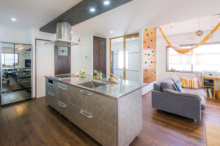 約3年前に奥様の実家の1〜3階を全面リノベーションし、3世代で同居するAさん一家。1階をお父様のプライベートスペースとし、2階をLDK、3階をご夫婦の寝室と子ども部屋に。いずれも開放感と明るさを重視した間取りで、過ごす時間の長いLDKは床に無垢材を採用し、壁は施主施工の漆喰塗りにした。その調湿効果のおかげなのか、ファンヒーターを使う冬場の結露は想像以上に軽く、強い匂いの料理を作っても翌朝にそれが残ることはないそうだ。 リビングで目を引くのが、窓際の壁に設けられたボルダリング。ご主人の要望により、専用コンパネで補強した壁に取り付けられたもので、見た目もインパクト大。体を動かすことが好きでアクティブな一家を象徴するようなコーナーだ。壁に向かって右半分は難易度が高く、左半分は比較的易しい位置取りになっている。登る頻度が最も高いのが息子さんで、遊びに来た友人と一緒に楽しむことも。ご主人はもちろん、奥様と娘さんもたまに登ることがあるという。 一方、奥様の憧れだった大きなアイランドキッチンは、知人が集まるパーティーなどの際、テーブル代わりにもなってとても便利。奥様が朝早く出勤する日は、家族それぞれが同時にキッチンに立ち、パンやご飯など好みのものを準備するにも、この広いキッチンが活躍。背後の食器棚との空間にもゆとりがあり、互いに行き交いもスムーズにできる。以前のキッチンが狭かった分、その利便性を大いに実感しているようだ。また、3階の子ども部屋には現在一時的に奥様の弟さんが同居をしているが、開放的な間取りで部屋を家具などで仕切っていないため、狭小感は感じていない様子。 子どもたちの成長につれて共に過ごす時間が少なくなってはいても、家族みんなが心からくつろげる安らぎの空間は、これからも変わることなく家族の中心にあり続けることだろう。