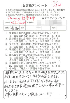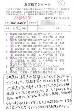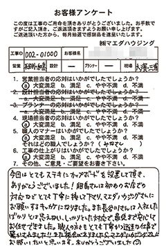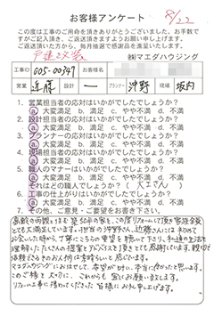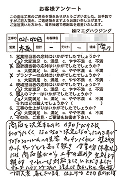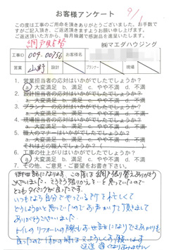 高齢の両親と住む築50年の家を、この度リフォームして頂き家族全員とても満足しております。担当の沖野さん、近藤さんには初めてお会いした時から、丁寧にこちらの要望を聴いて下さり、私達の生活を理解したたくさんの提案とアドバイスを頂きとても感謝しています。親切で信頼できるそのお人柄は素晴らしいと感じています。 |