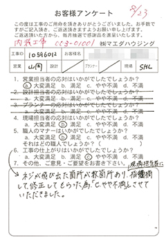 ネジが飛び出した箇所が数カ所あり、現場担当者に指摘して、修正してもらった為、「C.やや不満」とさせていただきました。 |