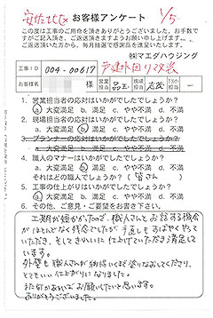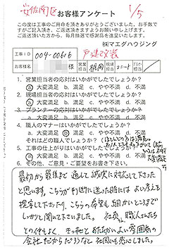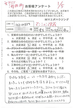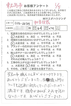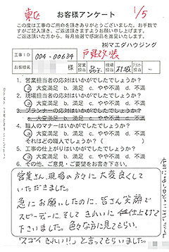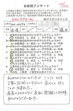 テキパキと導いてもらいあっという間に工事が完了。気持ちのいい晴れやかな日々を過ごさせていただいております。大変お世話になりました。ありがとうございました。 |