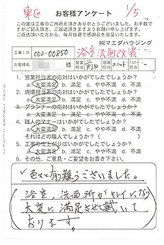 初めての工事でしたが、色々こまかい所まで提案いただき、きれいになった洗面所が、きれいで、気持ちいい空間になりました。又、次にと思える対応でこちらを選んでまちがいではなかったと感謝です。 |