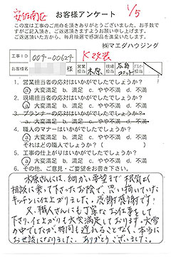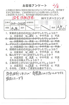 最初から最後まで通して誠実に対応して下さったと思います。こちらが判断に送った時にはよい考えを提案して下さったり、こちらの希望も細かいところまでしっかりと聞いて下さいました。社員さん、職人さんたちとの仲もよく、きっとあたたかいよい雰囲気の会社だからだろうなと社風にも感心しました。 |