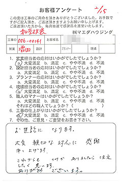 前田さんには大変お世話になりました。丁寧で、迅速な対応で、年内にリフォームも全て終わり、お陰様で良いお正月を迎えることができました。入社1年目と伺いとても驚きました。とても優秀な方ですね。今後とも宜しくお願い致します。 |