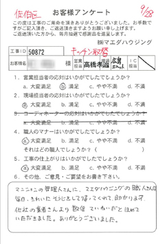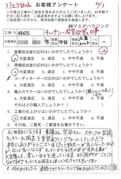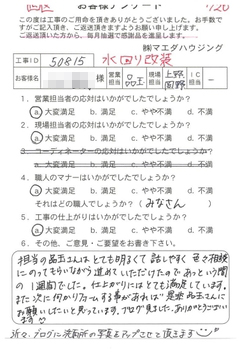 夕方、予約なしでご訪問したが、対応していただき、ありがとうございました。お勧めのメーカー、品を提示して、こちらの要望(予算・工事終了時期)を聞いて、実施していただき、大満足でした。 |