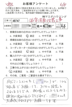 施工 五日市店 施工箇所 浴室洗面改装工事 同じマンションの方が、こんど宇品店でお願いして、おフロの改装をされるそうです。我が家の仕上りをみて、御社に決められたそうですので、大満足されるよう、お願いします。 |