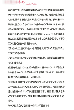 春の頃です。近所の電気屋さんのチラシに脱衣所に電気ストーブがチラシが掲載されていました。冬寒く電気屋さんに電話すると職人さんが来て下さいました。我が家のお風呂を見ると、うちでやってもらわなくても良いですが、奥さんお風呂のリフォームの方が良いですと言ってもらいました。わかっているのですが主人を説得。。。。。主人がまだまだこのお風呂が使えるとのことです。なんとか説得してTOTOに行くと縮小営業ショック、 |
