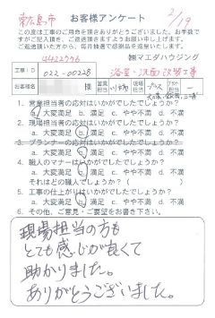 施工箇所 浴室キッチン改装工事 営業担当の方、職人さんも感じ良くて ていねいに対応して下さり何も言う事はありません。工事の仕上りも満足しております。ありがとうございました。今後もどうぞ宜しくお願い致します。 |