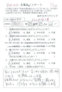 施工箇所 トイレ改装工事 現調時もその日に対応してもらい、又、工事もすみやかに終了してもらいよかったです。営業担当の方は誠実な対応をしてもらい、マエダハウジングにして良かったと思います。 |