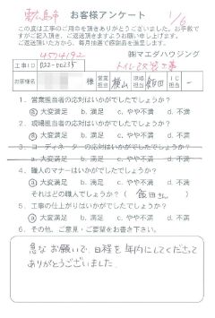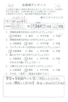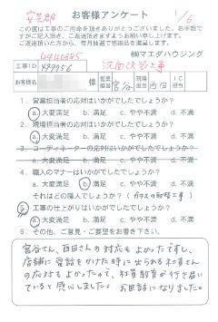 施工箇所 洗面改装工事 宮谷さん、西田さんの対応もよかったですし、店舗に電話をかけた時に出られる社員さんの対応もよかったので、社員教育が行き届いていると感心しました。 |
