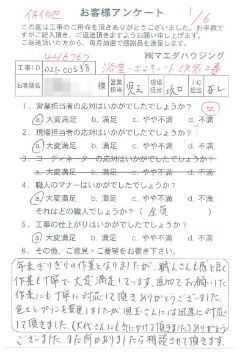 施工箇所 浴室・エコキュート改装工事 年末ぎりぎりの作業となりましたが、職人さんも感じ良く 作業も丁寧で大変満足しています。追加でお願いした作業にも丁寧に対応して頂きありがとうございました。色々とプランを変更しましたが、児玉さんには迅速に対応して頂きました。(大代さんにも気にかけて頂きました)ありがとうございました。 |