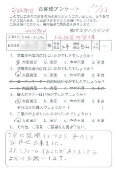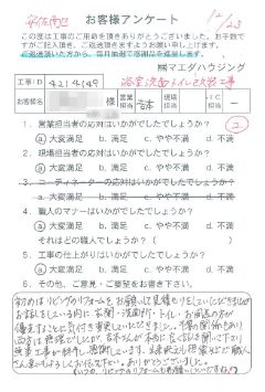 施工箇所 浴室洗面トイレ改装工事 初めはリビングのリフォームをお願いして、見積もりをしていただきましたが、お話しをしている内に、玄関・洗面所・トイレ・お風呂の方が優先することに気付き変更していただきました。予算の関係もあり、両方は無理でしたが、吉本さんが本当に良く話を聞いて下さり、無事工事が終了し、感謝しています。出来映えも想像以上で職人さん達にもよろしくお伝え下さい。ありがとうございました。 |