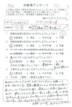 施工箇所 キッチン取替工事 今度はお世話になりました。営業の松本さんはとても信頼できる方だと思いました。対応がとてもフレキシブルで、ガスコンロだけ自分で手配しました。リフォームプランを松本さんのアドバイスで大幅に変更しましたが、リフォームを縮小する内容で、御社の利益の為だけでなく、顧客側に親身になって下さいます。友達にも紹介したくなります。社風かなぁと思いました。 |