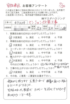 マンションの共用部分の養生も丁寧にしていただき安心して工事してもらうことができました。 |