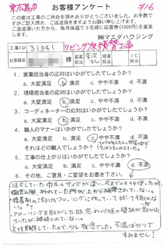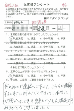 施工 東広島店 施工箇所 LDK・洋室改装工事 施工費用 約280万円 林様には大変お世話になりました。ショールームの日程調整や、質問等に対してもすぐに答えていただき、助かりました。また、日程的にも短かったですが、みなさまにがんばっていただき無事引っ越しも出来ました。もし、またなにかありましたらよろしくお願い致します。 |