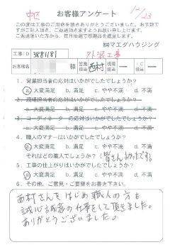 施工箇所 外装工事 他社と比較検討した上で、契約の決め手となったのは、西村さんの誠実なお人柄でした。迅速丁寧なその姿勢は、終始変わることはありませんでした。この間様々な質問をしましたが、その都度誠実に回答頂き、また羽根蟻の話等からも、勤勉な方だと察しました。何よりも、当方のリクエストに応えて炎天下、自ら汗を流し作業にあたって下さった姿を忘れることが出来ません。 |