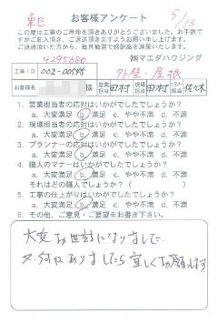 建物 戸建て 今回、素敵に仕上げて頂き、大変ありがとうございました。担当の田村さんが本当に親切な方で わからないことも丁寧に教えて下さり 最後まで安心してお任せすることができました。足場から始まり 壁まで携わって頂いた全ての方が良い方々で、特に壁塗装の際は、朝 ″今日は○○をしようと思います″帰りは ″今日は○○しました″と報告して頂き 安心できた部分が大きいです。本当にマエダハウジングさん、田村さんにお願いをして良かったと思っています。ありがとうございました。 |