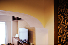 | 前田さん: | マンションだと、邪魔になるからといって梁などの構造体に手を出すことはできません。このリビングも、天井の梁の部分は動かすことができなかったので、壁際をアール型にすることで逆に雰囲気が良くなりました。とっても気に入っています。実はこのマンションを買った後、佐々木さんたちと見に来たのですが、リノベーションできないことが予想以上に多いと気付いた時、私は大きな不安を感じました。梁のことだけでなく、床下を通っている配管の関係で、LDKに段差を付けなければならないという問題にも直面し、だんだん残念なことが判明していったんです。あの時は、「もう、すてきなリフォームなんてできないかも...」と不安にもなりましたが、そこを佐々木さんたちと考えながらクリアできて、本当に良かったと思います。 |