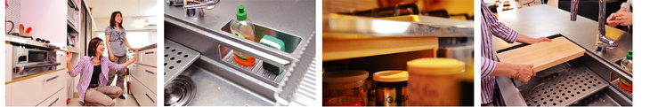 | 松永さん: | 天板は熟練職人がステンレスを折り紙のように折り曲げ、角を全部溶接して仕上げるので、寸法も自由に設定していただけます。食器用洗剤やスポンジの置き場も、すべて職人の手によるものです。 |