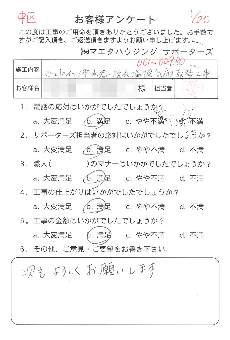 中区 ビルドイン浄水器・脱衣場換気扇取替工事