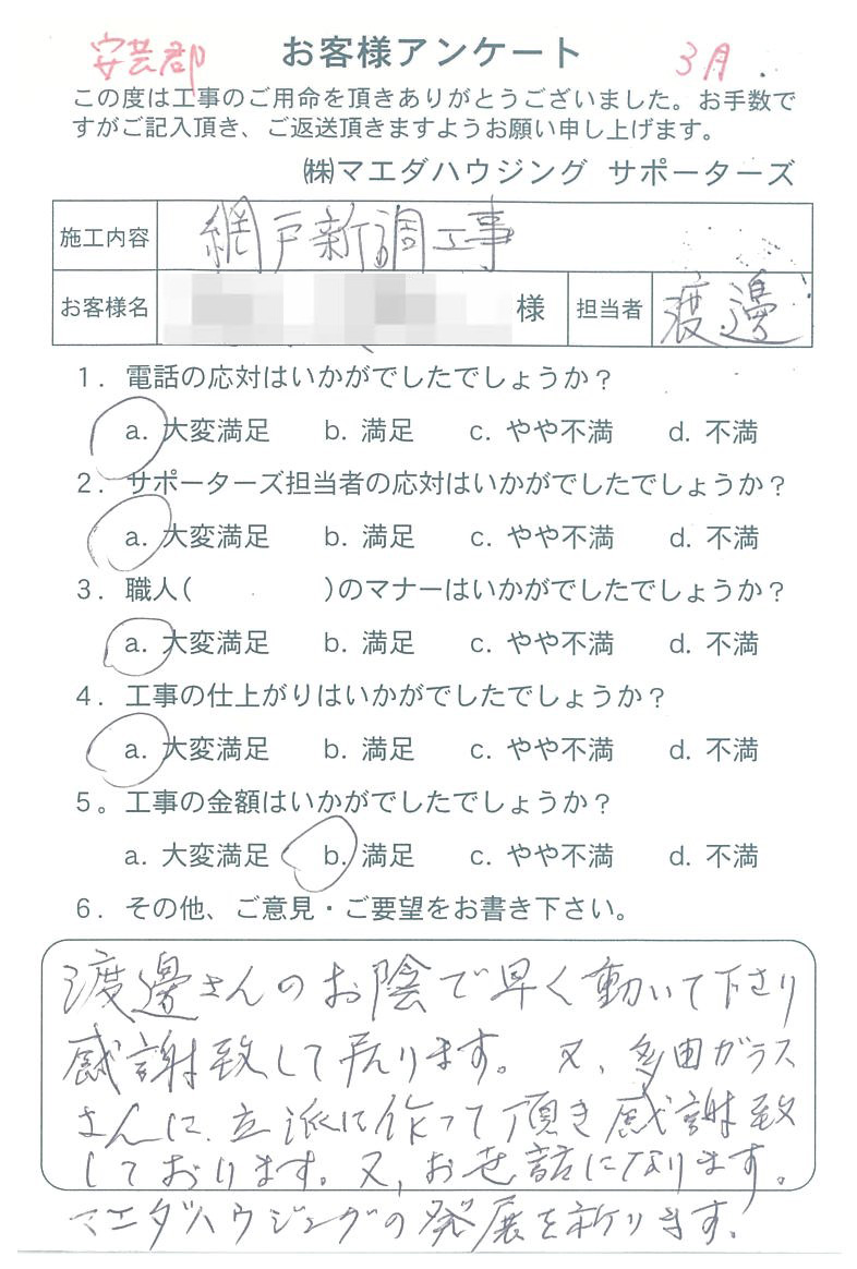 渡邊さんのお陰で早く動いて下さり感謝致して居ります。又、多田ガラスさんに立派に作って頂き感謝致しております。又、お世話になります。マエダハウジングの発展を祈ります。