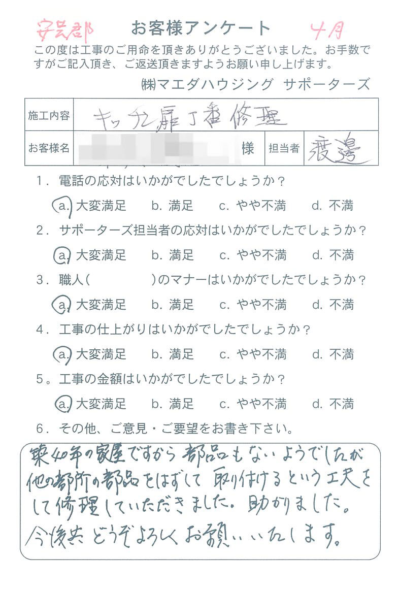 築40年の家屋ですから部品もないようでしたが、他の場所の部品を外して取り付けるという工夫をして修理していただきました。助かりました。今後共どうぞよろしくお願いいたします。