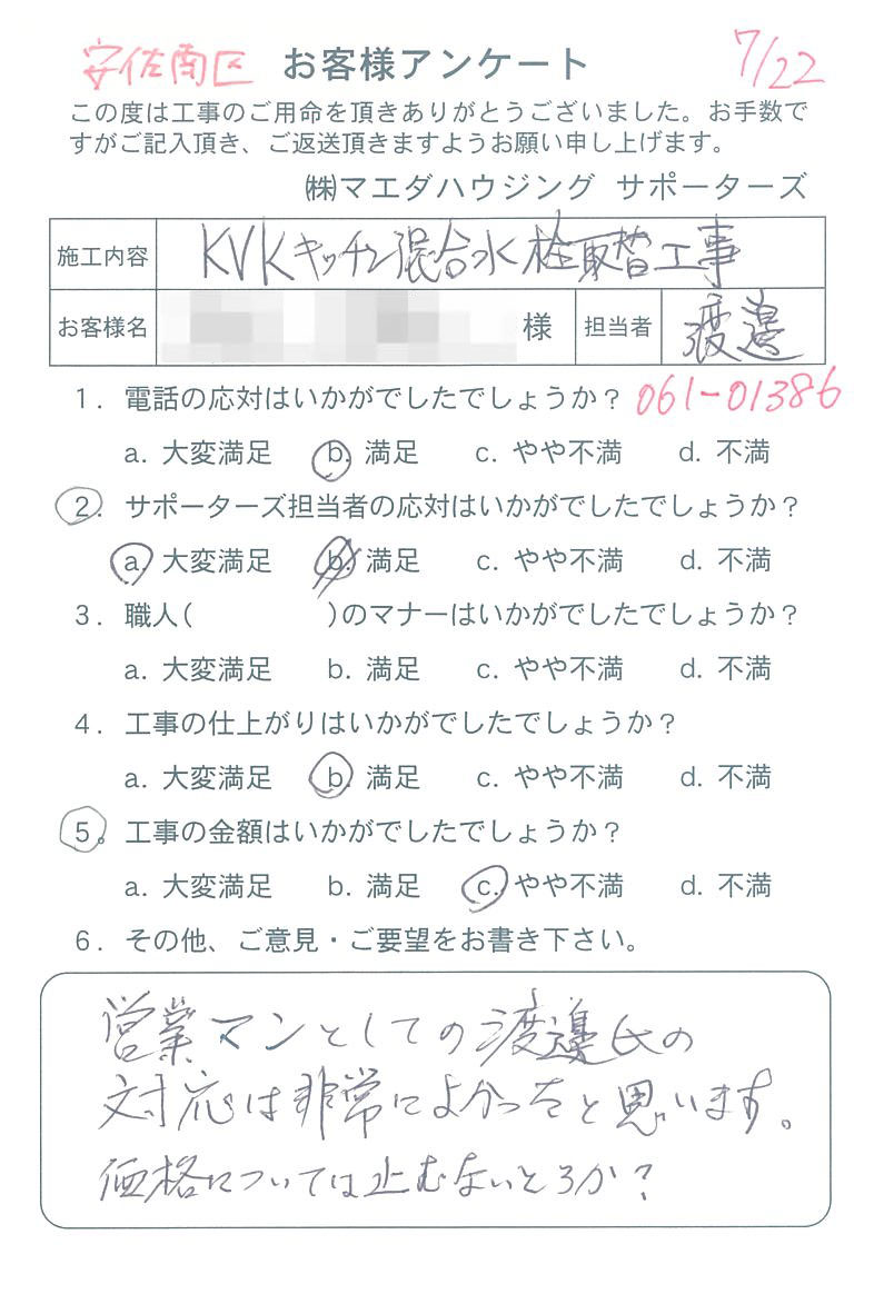 安佐南区 KVKキッチン混合水栓取替工事