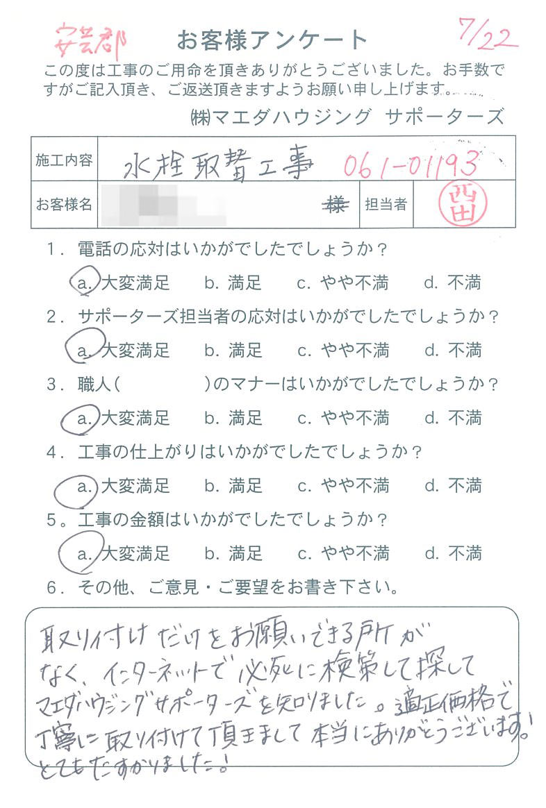 施工内容 水栓取替工事 取り付けだけをお願いできる所がなく、インターネットで必死に検索して探して、マエダハウジングサポーターズを知りました。適正価格で丁寧に取り付けて頂きまして、本当にありがとうございます。 |
