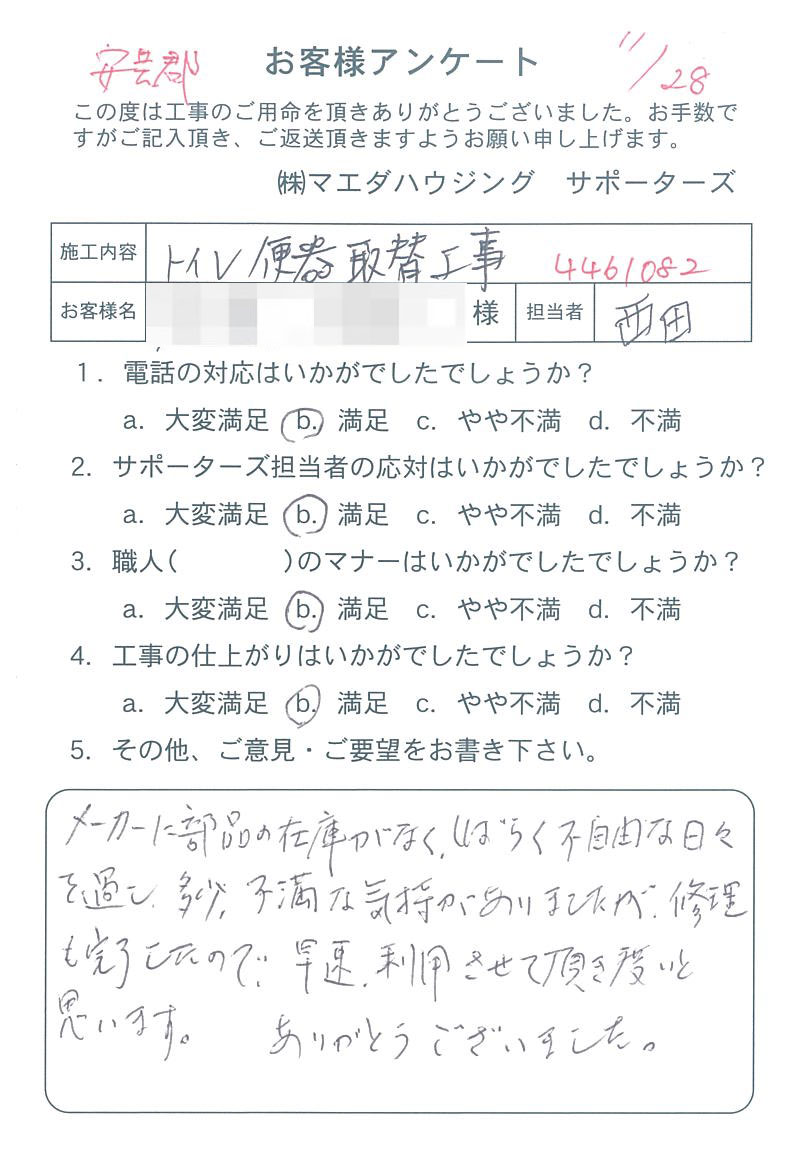 メーカーに部品の在庫がなく、しばらく不自由な日々を過し、多少不満な気持がありましたが、修理も完了したので、早速、利用させて頂きたいと思います。ありがとうございました。