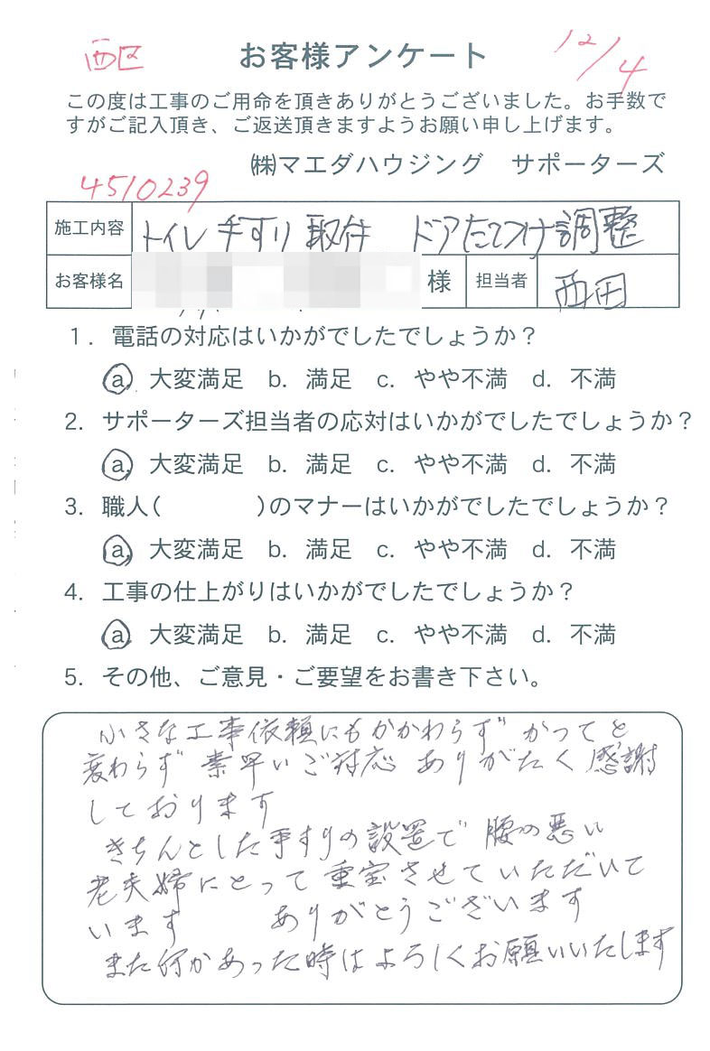 小さな工事依頼にもかかわらず、かつてと変わらず素早いご対応 ありがたく感謝しておりますきちんとした手すりの設置で 腰の悪い老夫婦にとって重宝させていただいています ありがとうございますまた何かあった時はよろしくお願いいたします
