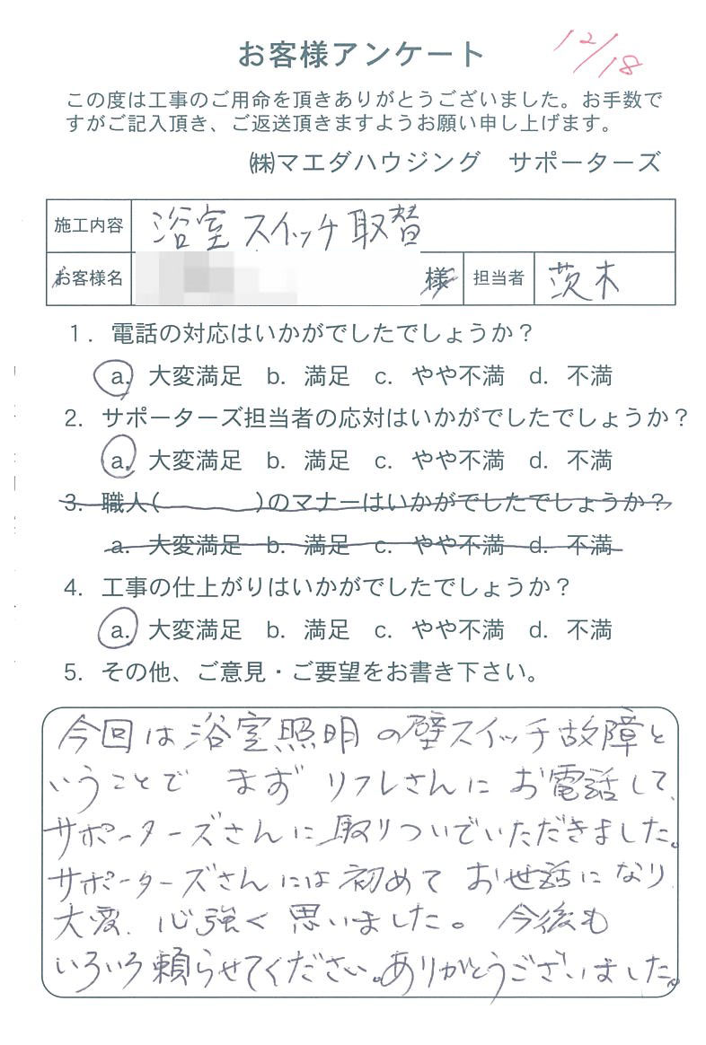施工内容 浴室スイッチ取替 今回は浴室照明の壁スイッチ故障ということで、まずリフレさんにお電話して、サポーターズさんに取りついでいただきました。サポーターズさんには初めてお世話になり、大変心強く思いました。今後もいろいろ頼らせてください。ありがとうございました。 |