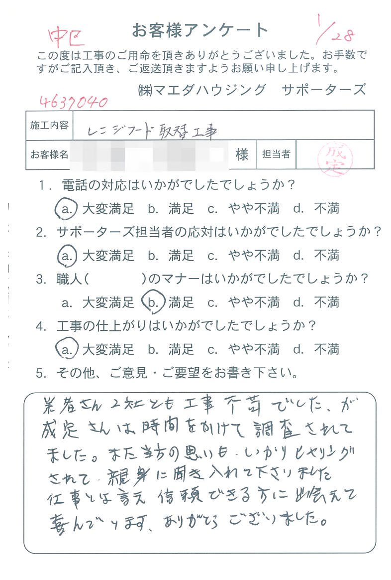 施工内容 レンジフード取替工事 業者さん2社とも工事不満でしたが、成定さんは時間をかけて調査されてました。また当方の思いもしっかりとヒヤリングされて、親身に聞き入れて下さりました。 |
