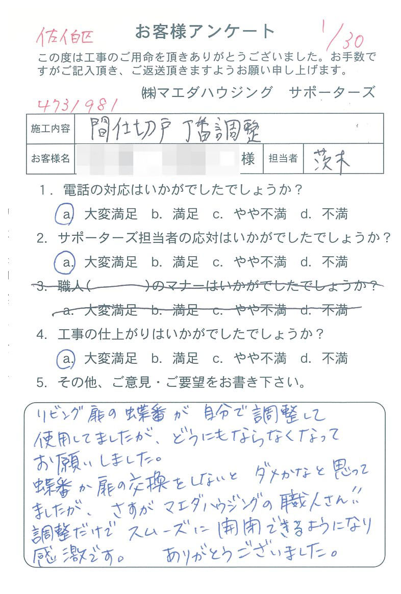 リビング扉の蝶番が自分で調整して使用してましたが、どうにもならなくなってお願いしました。蝶番か扉の交換をしないとダメかなと思ってましたが、さすがマエダハウジングの職人さん!!調整だけでスムーズに開閉できるようになり感激です。ありがとうございました。