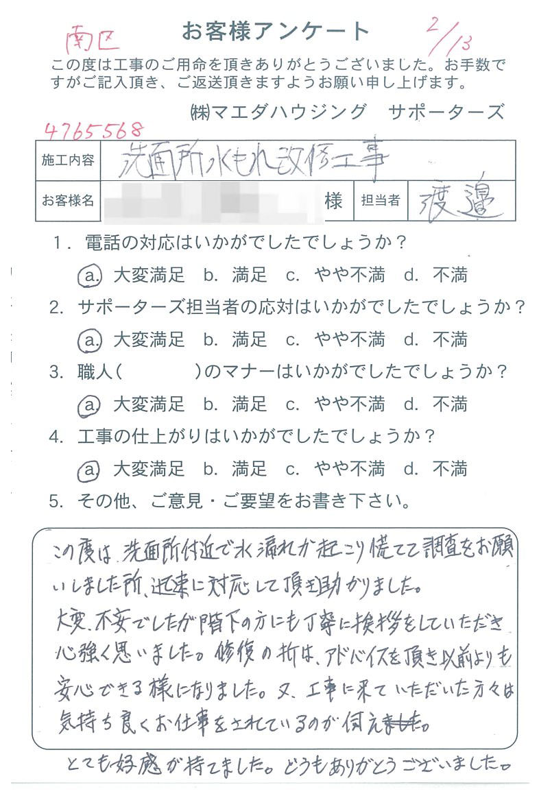 この度は、洗面所付近で水漏れが起こり慌てて調査をお願いしました所、迅速に対応して頂き助かりました。大変、不安でしたが階下の方にも丁寧に挨拶をしていただき、心強く思いました。修復の折は、アドバイスを頂き以前よりも安心できる様になりました。又、工事に来ていただいた方々は気持ち良くお仕事をされているのが伺え、とても好感が持てました。どうもありがとうございました。