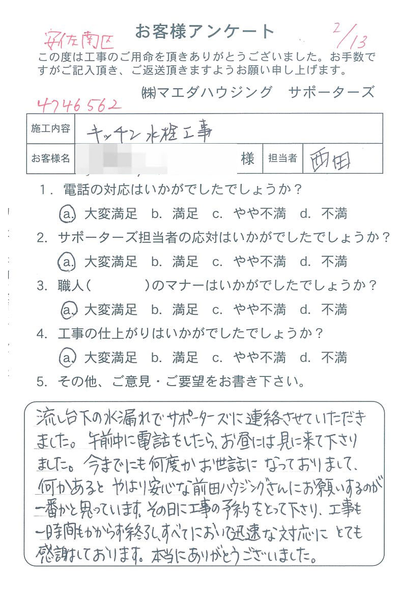 施工内容 キッチン水栓工事 流し台下の水漏れでサポーターズに連絡させていただきました。午前中に電話をしたら、お昼には見に来て下さりました。今までに何度かお世話になっておりまして、何かあるとやはり安心な前田ハウジングさんにお願いするのが一番かと思っています。その日に工事の予約をとって下さり、工事も一時間もかからず終了し、すべてにおいて迅速な対応にとても感謝しております。本当にありがとうございました。 |