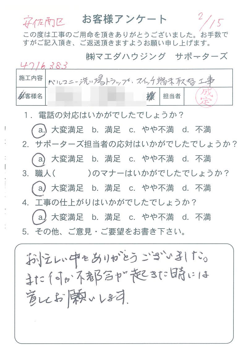 安佐南区 バルコニー洗い場トラップ、スイッチ端末取替工事